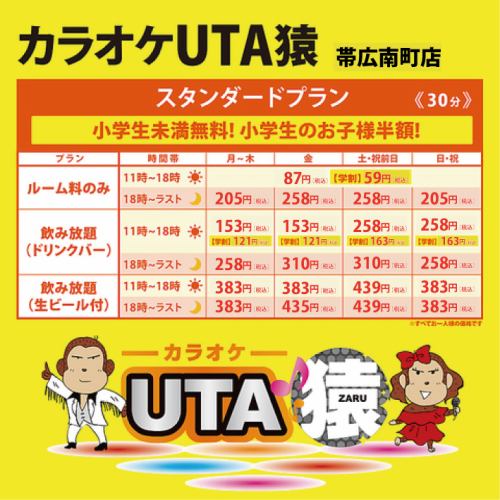 スタンダードプラン!30分毎の料金表です。■ルーム料金■飲み放題(ドリンクバー)■飲み放題(生ビール付)